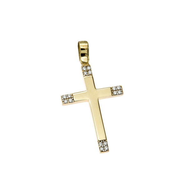 A stunning chain cross in 14k gold with an elaborate design adorned with white zircons and a lustrous matte finish. Ideal for a girl’s baptism.