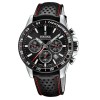 An impressive Festina model with a stainless steel case and a black leather strap with red stitching. The dial in black with embossed elements and hands in silver-white with red details.