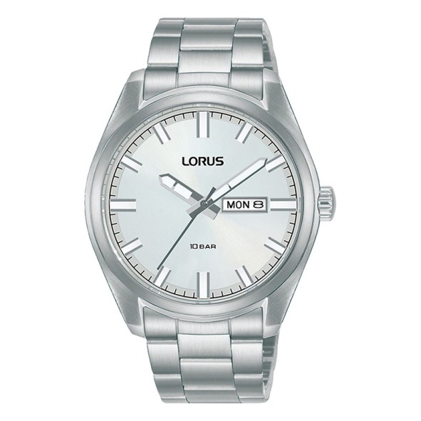 A classic Lorus men’s watch with a silver-tone stainless steel case and bracelet. The dial is white in color and has silver colored indicators and markers.