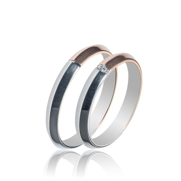 Impressive wedding-engagement rings by Maschio Femmina of the Sottile series in white gold and rose gold with a lustrous finish and a stone (zirgon or brilliant) on the women’s ring. You can place your order in 9, 14 or 18 carats.