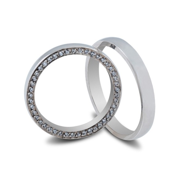Impressive wedding-engagement rings by Maschio Femmina of the Sottile series in white gold with an elaborate design, lustrous finish and adorned with 90 stones (zirgon or diamonds) the women’s wedding ring. You can place your order in 9, 14 or 18 carats.