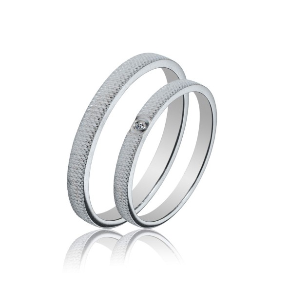 Impressive wedding-engagement rings by Maschio Femmina of the Sottile series in white gold with an elaborate design, lustrous finish and embellished with one stone (zirgon or diamond) the women’s wedding ring. You can place your order in 9, 14 or 18 carats.