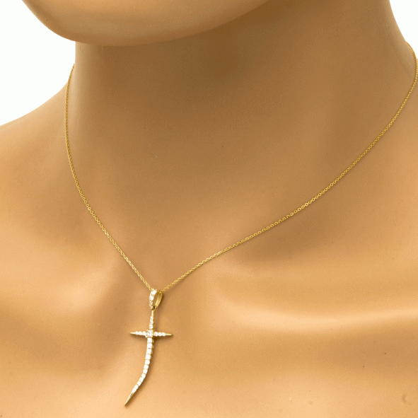 An impressive women’s cross in 14 karat gold with an elaborate design adorned with sparkling zircons.