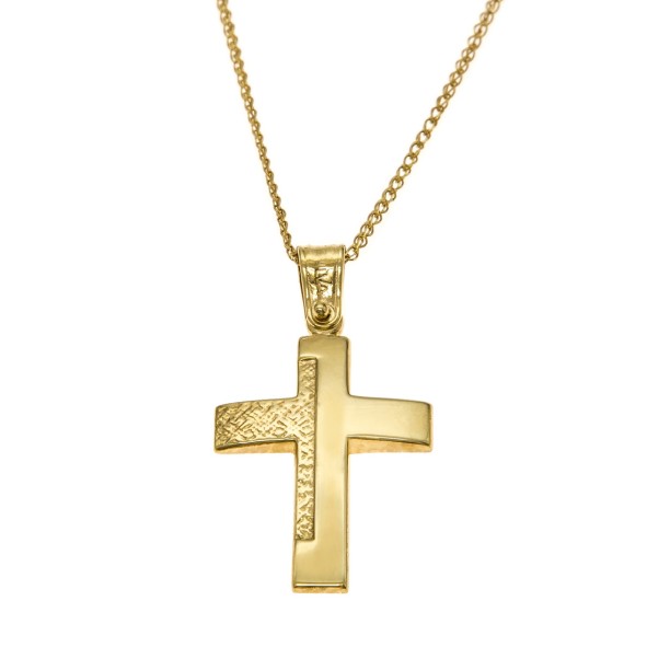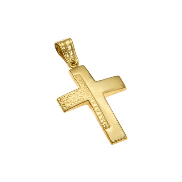 An impressive cross of 14 carat gold with intricate pattern in glaze and forged finish.