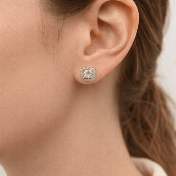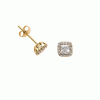 Impressive rosette earrings in 9 karat gold with an elaborate square-shaped design adorned with sparkling zircons.