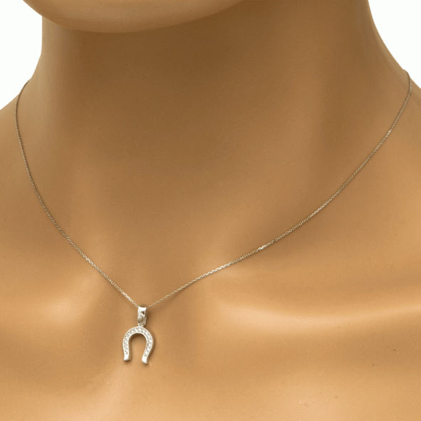 A stunning 14k white gold pendant with an elaborate horseshoe design adorned with white zircons.