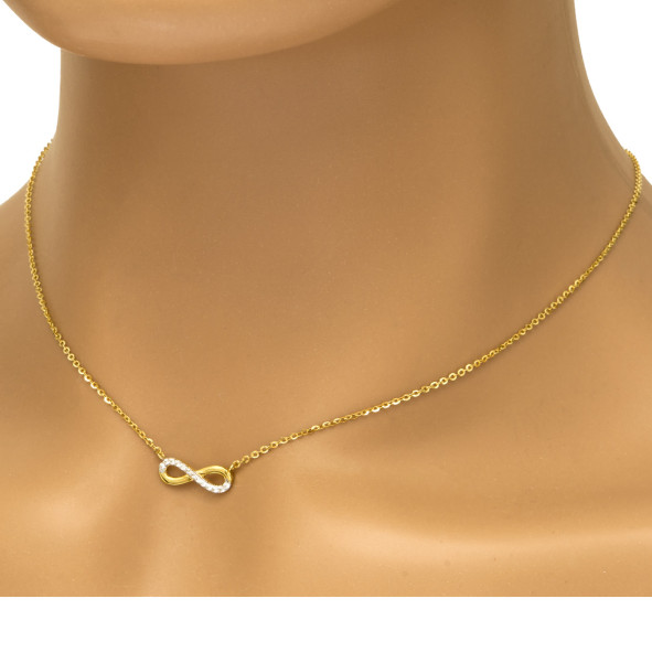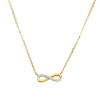 A stunning 14k gold necklace with an elaborate infinity design adorned with white zircons.