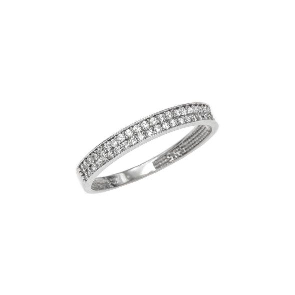 An impressive 14 carat white gold row ring with glossy finish and intricate design adorned with white zircons.