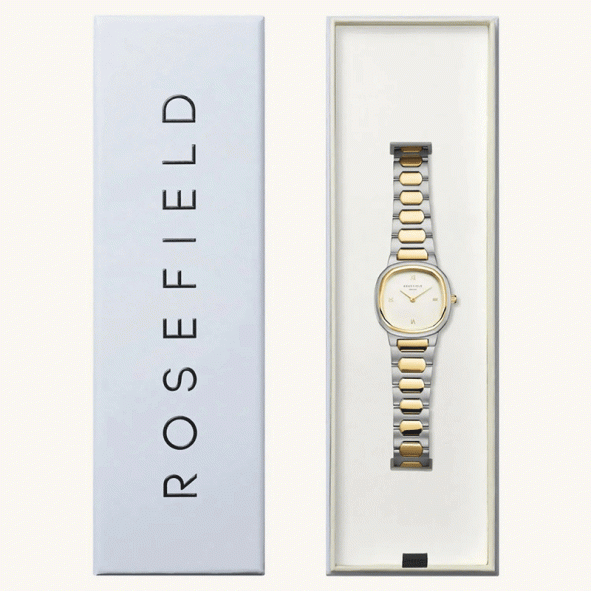 An impressive ROSEFIELD watch from the Gaia series with a brass case and a gold-silver stainless steel bracelet. The dial is cream-colored with gold-colored elements and hands.