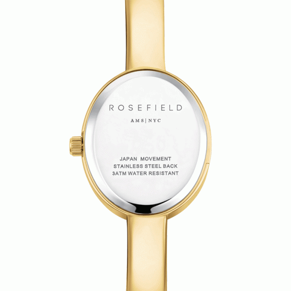 An impressive ROSEFIELD watch from the Studio series with a gold-colored brass case and bracelet. The dial is white with gold-colored elements and markers.