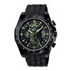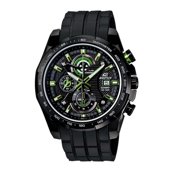 Ένα μοντέλο Casio EFR-523PB-1AVEF με κάσα από ανοξείδωτο ατσάλι σε μαύρο χρώμα και μαύρο καουτσούκ λουράκι. Το καντράν σε μαύρο χρώμα με ανάγλυφα στοιχεία και δείκτες σε πράσινο-μαύρο χρώμα.