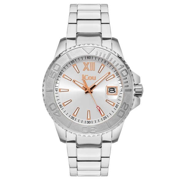 Ένα εντυπωσιακό αδιάβροχο γυναικείο ρολόι JCOU της σειράς SIREN με κάσα και μπρασελέ από ανοξείδωτο ατσάλι σε ασημί χρώμα. Το καντράν σε ασημί χρώμα με ενδείξεις και δείκτες σε ροζ χρυσό χρώμα.